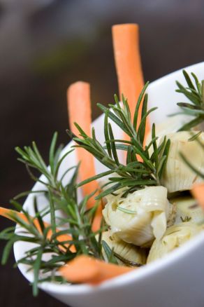 Add slivered artichoke hearts to the carrot salad marinade. Serve the carrot salad sprinkled with smoked red pepper such as “piment d’espelette” from France . Add a teaspoon of cappers and a small handful of arugla leaves to the marinated carrots, serving this combination with grilled monkfish or sea caught shrimp.