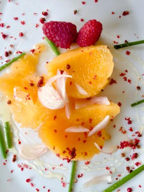 The classic antipasto ‘prosciutto e melone’ was the impulse for the creation of a salad composed of bright melon, crunchy marinated shallots, crushed pink peppers, threads of fresh chives and ruby-red juicy raspberries. My recipe juxtaposes sweet and sour with aromatic herb and spice.