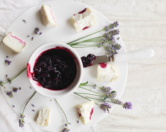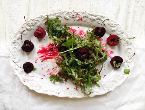 Put the arugula in a mixing bowl and drizzle it with olive oil. Add salt and a noticeable scattering of black pepper. Stir two heaping tablespoons of currants in the bowl and toss it lightly through the arugula. Place the dressed leaves on a platter. Arrange the goat’s cheese and the pitted cherries around the salad and decorate it with fresh lavender. Enjoy the sourness of the currants with the peppery arugula glistening with olive oil and pepper, contrasted by the smooth goat’s cheese, not to mention the amazingly juicy cherries.