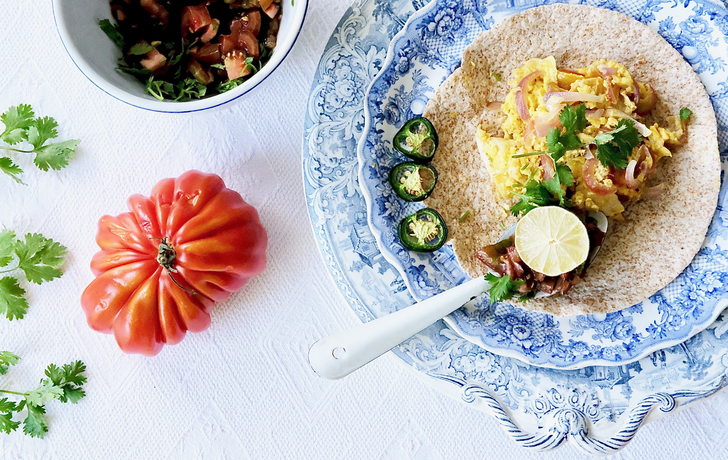 Pour the whisked eggs into the skillet with the peppers and onions. Scramble the eggs until just set and turn off the heat. Add the toasted tortilla strips and continue stirring. Pop in the remaining whole wheat tortillas into the warm oven just for a few moments. Put the warmed tortillas into a bowl and spoon in the scrambled eggs. Squeeze the roasted lime halves over the eggs and top them with a big spoon of diced tomatoes. Top the eggs with a few slices of roasted jalapeños and enjoy breakfast at any time of the day.
