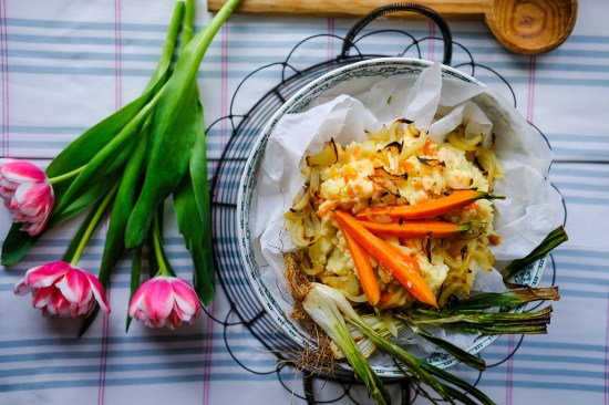Since I like different textures on my plate, I prefer to treat my carrots and onions to some roasting in the oven while the potatoes boil, rather than boiling all ingredients together like a traditional hutspot. This only adds about ten minutes of extra cooking time and I think it makes for a dish that is perfect even for a dinner party. Below is my recipe twist for hutspot, but please feel free to cook according tow what works best in your kitchen !