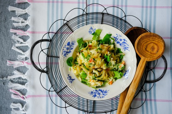 The proportion between the potato and the chosen vegetable in a stamppot is generally equal in measure and this is what makes a bowl of Dutch mash so delicious. There are as many vegetables in the bowl as potato, and oddly enough one doesn’t miss a larger amount of potato, or even notice the lightness that the vegetables give. Eating them together is as comforting as eating a bowl of porridge and is a reminder of oh so many childhood-memory foods served with a spoon. This is I believe what makes a mashed pot like the stamppot so irresistible.