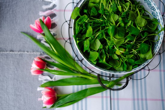 - in spring: a big handful of in season fresh greens like purslane or turnip tops