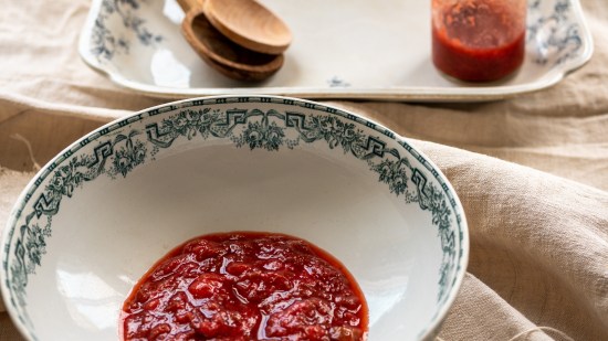 Combine strawberry and rhubarb conserve with anything that benefits from the pairing of sweet with savory. Think salad with a mixture of salty Pecorino, crumbled goat’s cheese or even feta. Stir it through yoghurt of any kind, whether made from dairy or with a plant base like almonds or coconut. Add it to granola or use it as a filling for a crostata. . .