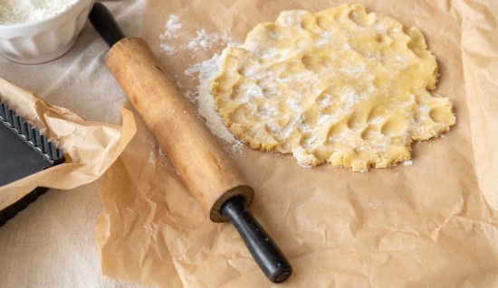 Cut a piece of baking paper into a circle large enough to cover the bottom and edges of a tart form of 18 centimeters in width. Shape the baking paper to fit, folding it into pleats around the edges. Remove the pre-shaped baking paper from the tart form and flatten it slightly. The chilled dough will be rolled out directly onto the paper.