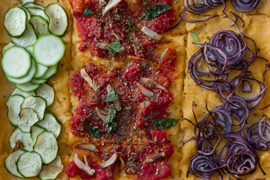 It took a while to figure out how to emulate a pizza-like crust with polenta. That being said, the deliciousness of grilled polenta comes very close to the kind of comfort found in the pizza experience. Even though polenta stays soft in the middle, and cannot imitate the chewiness a slow-rise wheat dough can, the finished result is a perfect stand-in to the original.