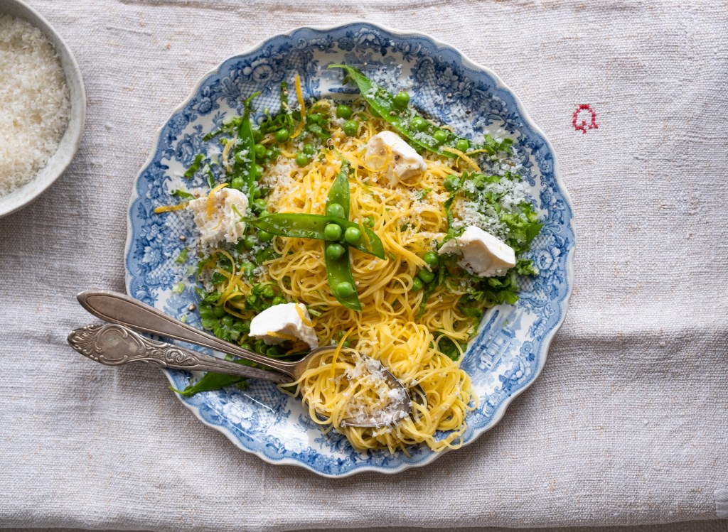 This pasta is complete as is. I like to add a small bowl of lemon zest, black pepper and grated Parmigiano to the table so everyone can add a personal touch. For a luxurious supper, add a few wedges of fresh, lightly-aged goat’s cheese or Robiola to the pasta, as you can see in the photo above.